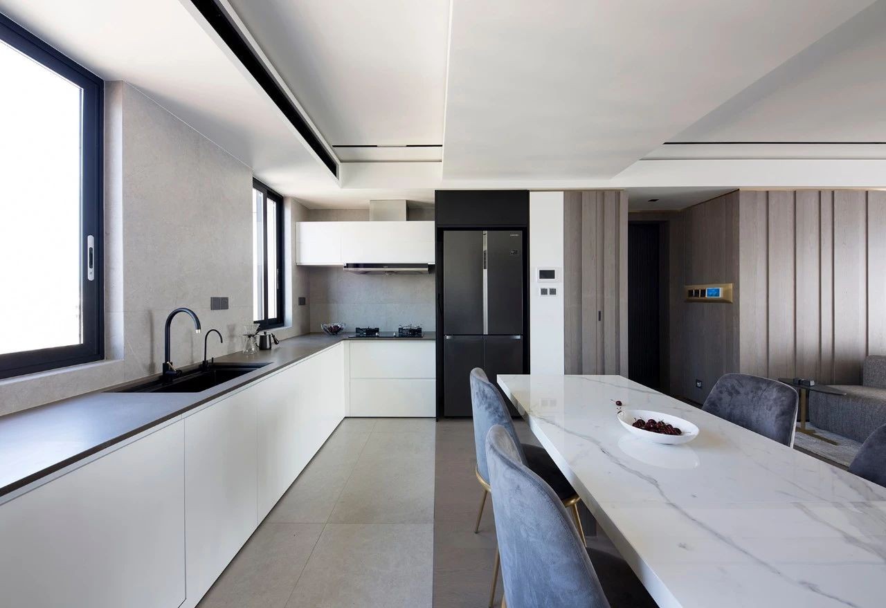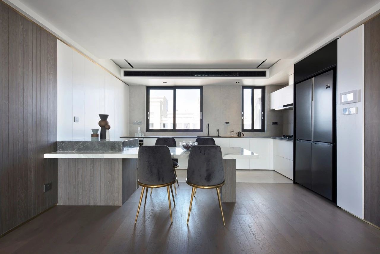 餐廳是家人情感的重要鏈接之處,設(shè)計師采用餐廚一體的設(shè)計手法,合理化利用空間,將餐廳與客廳一以貫之,增加空間的互動性, 屋內(nèi)光線通透,視線開闊,更能增進(jìn)家人間的溝通與情感。舒展輕快的氛圍盈滿其間,開啟自在真實(shí)的休閑與用餐體驗(yàn)