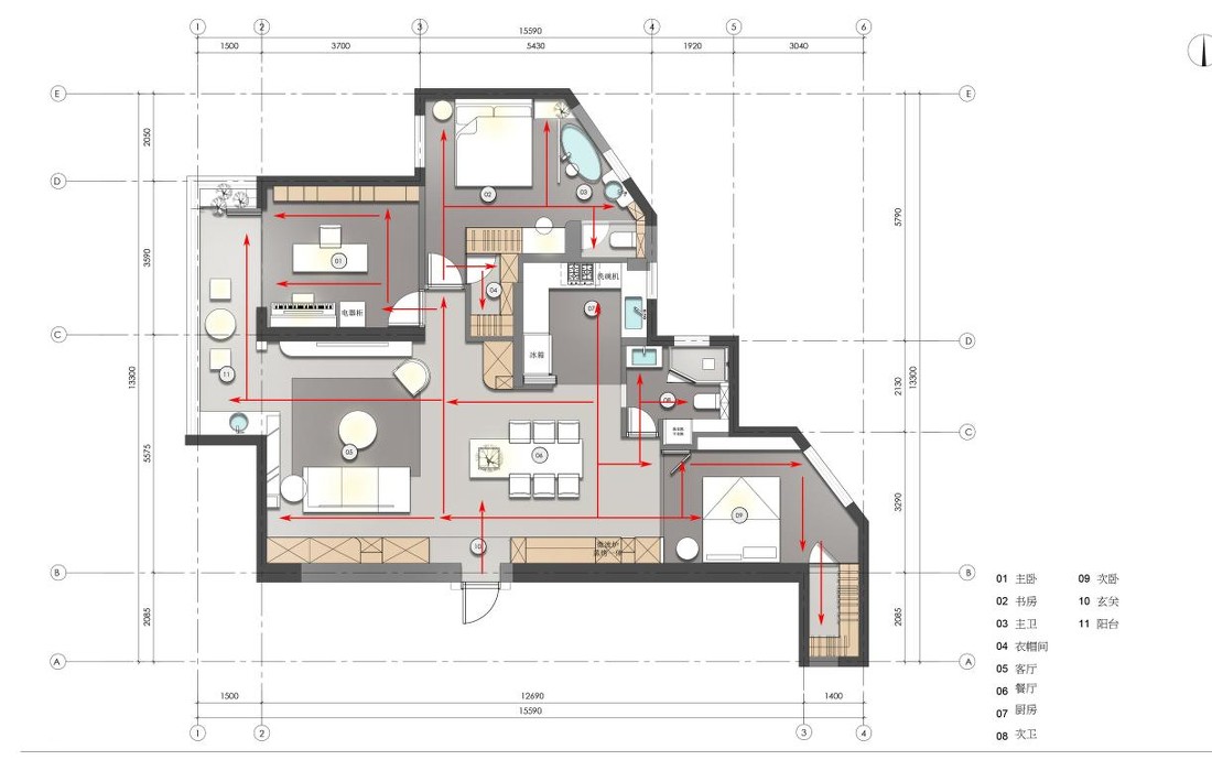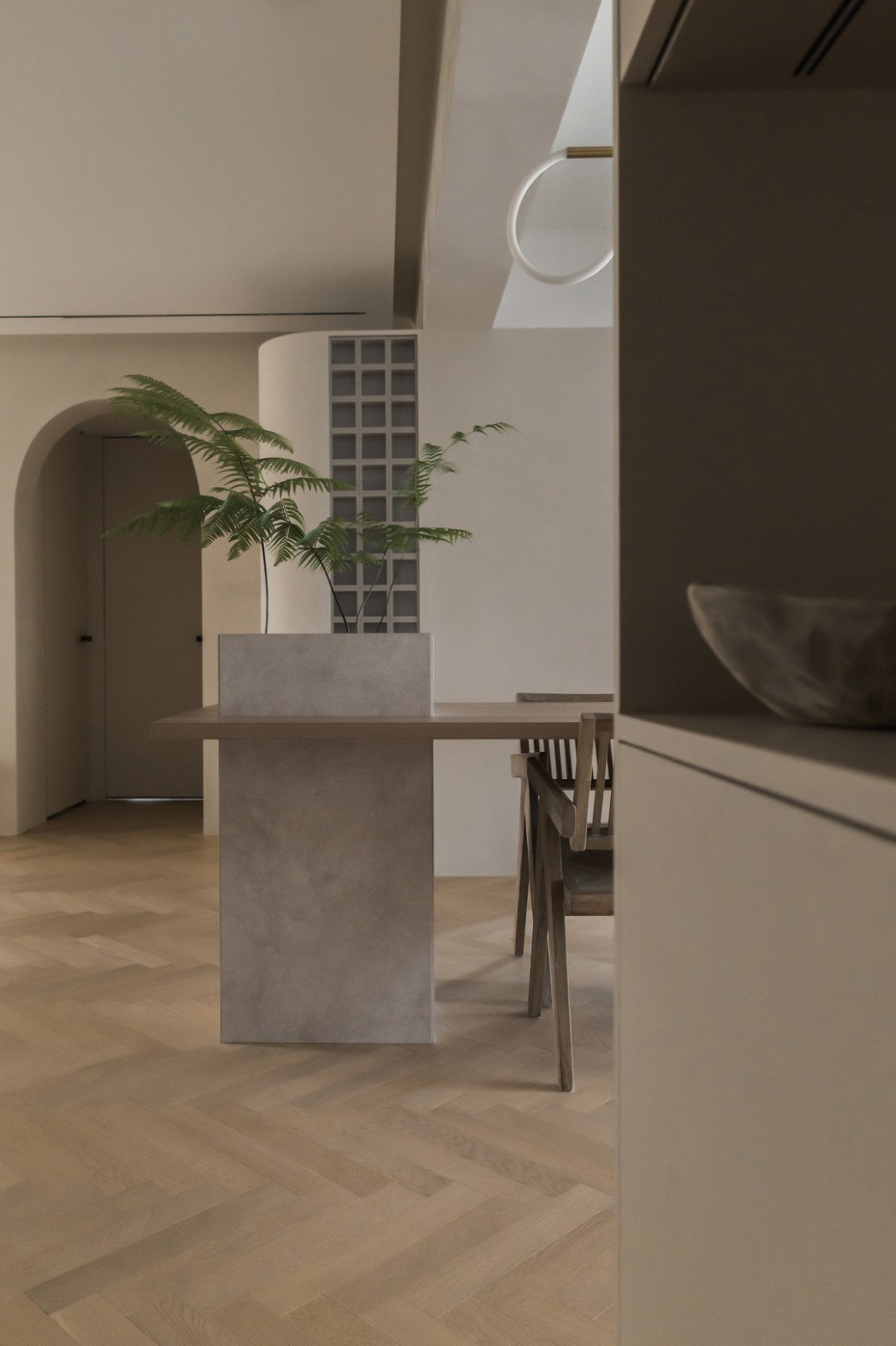 若以原戶型梁體劃分空間,客廳過大而餐廳過小,直接將餐挺區(qū)域外擴又會因為梁體而顯得不夠和諧,于是我們將背景墻做設(shè)計,以梁體為界,左側(cè)打造玻璃格子墻,同時以曲面過渡銜接,富有層次感的設(shè)計弱化了梁體的視覺效果,而餐桌+石臺的設(shè)計,也自然而然過渡了餐廳的空間,視覺感更為流暢舒適