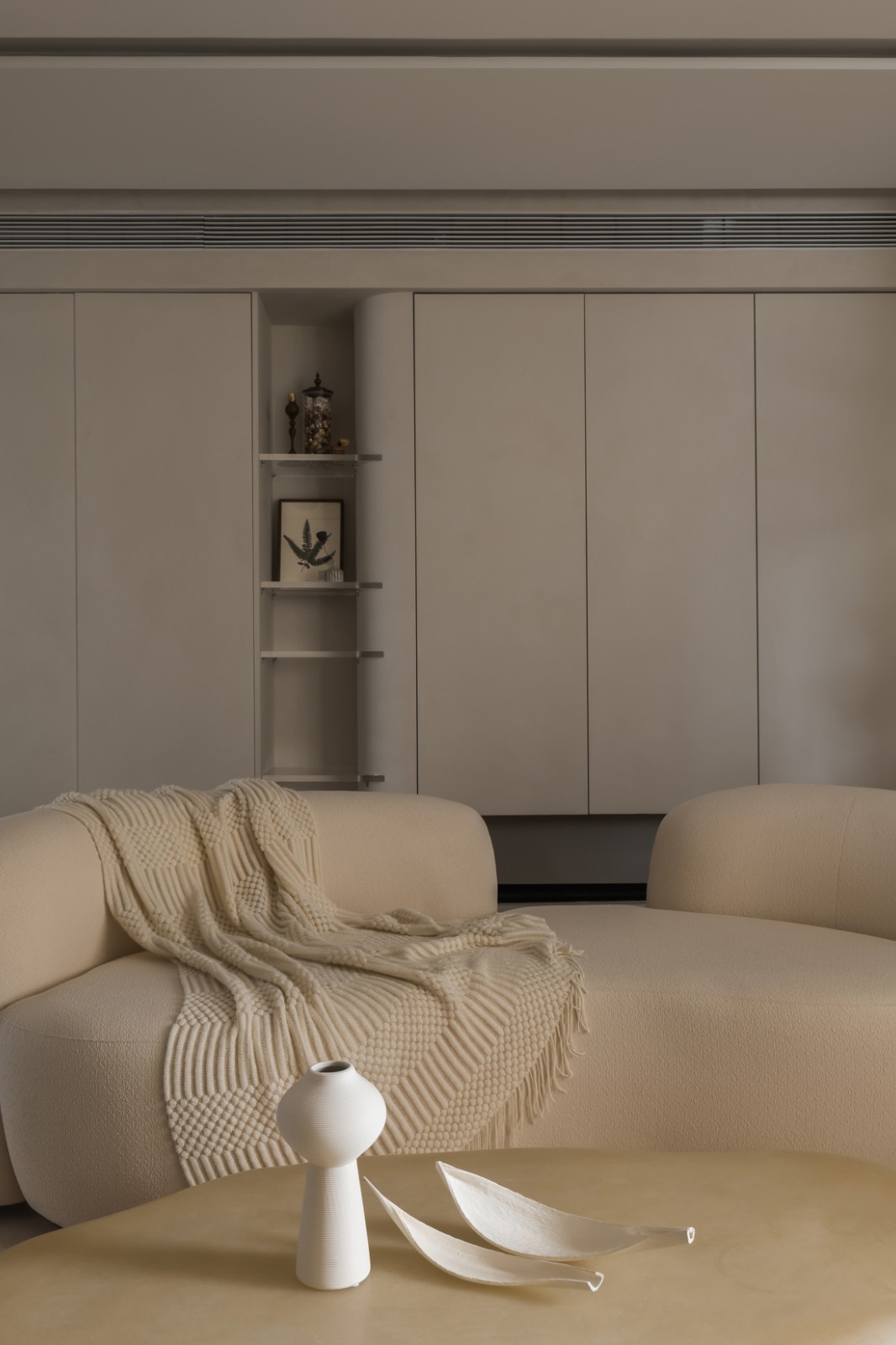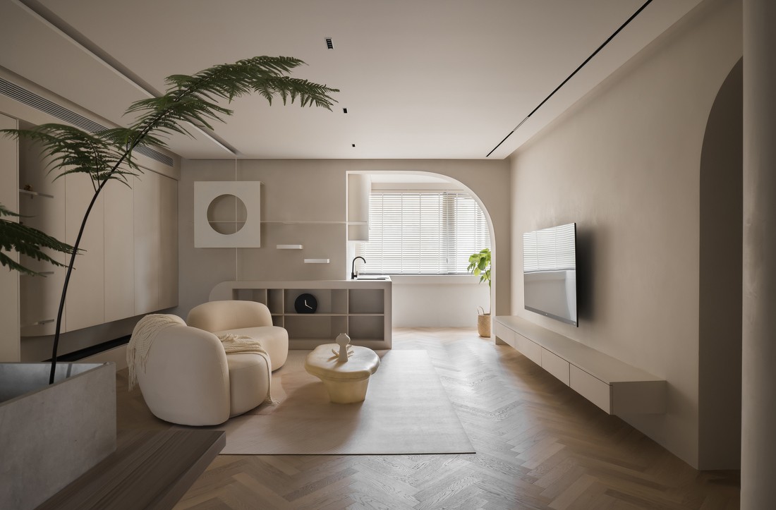 空間整體以素雅安靜的低飽和色為主,選擇奶油色系,讓空間在清簡寧靜的同時,也有家的溫馨和溫度??蛷d的布局也遵循自然簡約的原則,平面吊頂、無主燈設(shè)計、同色系的軟裝,讓空間視覺趨于一體,更為融洽,與陽臺之間的門洞采用弧形線條勾畫,結(jié)合空間的奶油色調(diào),更加溫柔流暢