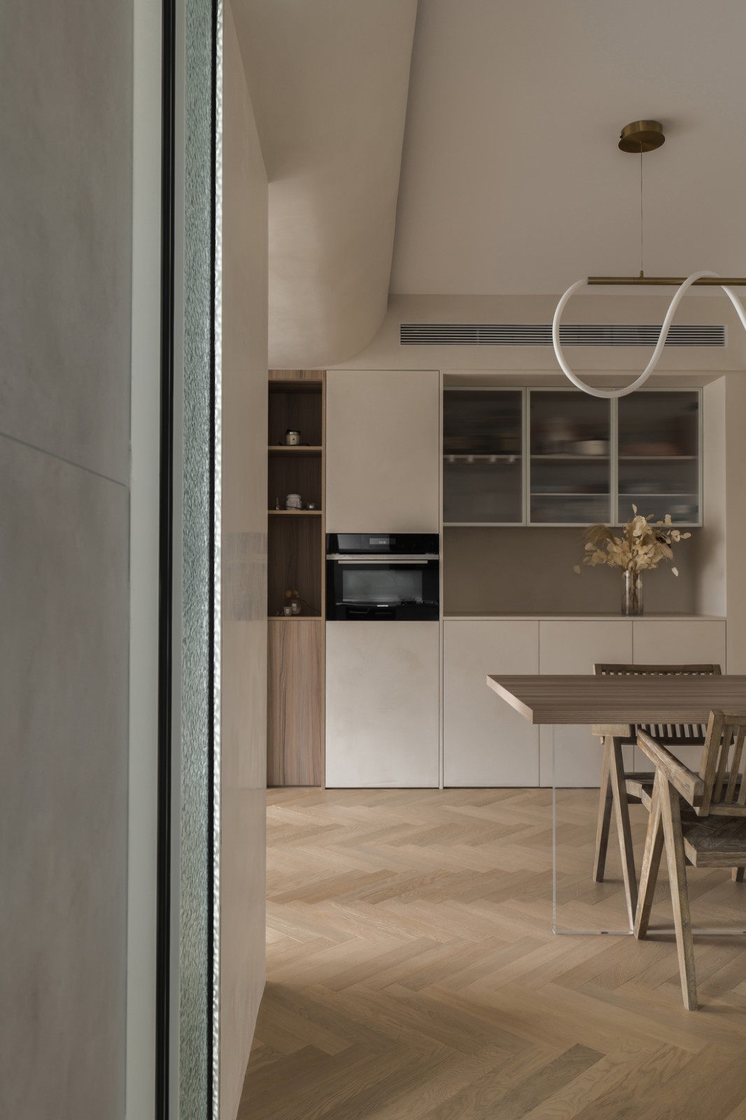 吊頂仍然以曲面過渡層次,銜接流暢自然。餐廳背景墻打造頂天立地餐邊柜,微水泥材質(zhì)與木質(zhì)形成視覺對比,層次更為豐富,嵌入大型廚電,為中廚節(jié)省空間。玻璃吊柜和開放格的設(shè)計,讓收納充足的同時也保證了視覺的輕盈感。