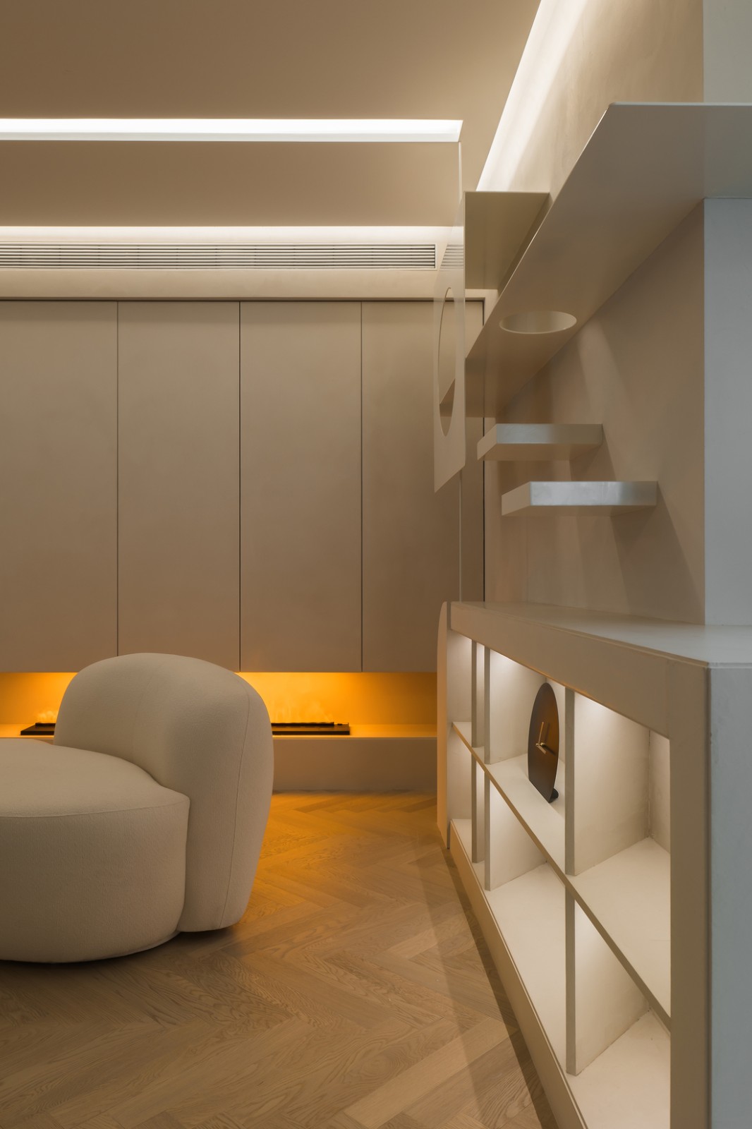 側(cè)面以擱板和展覽柜裝飾墻面,既能豐富墻面層次,也能用以展示屋主夫妻喜愛的珍藏,增添空間格調(diào)與品質(zhì)。收納柜沒有做到底,在下方留空一部分,不開燈時視覺更顯輕盈,開燈后搭配暖光燈帶,形成仿壁爐設(shè)計的視覺效果,增添氛圍感