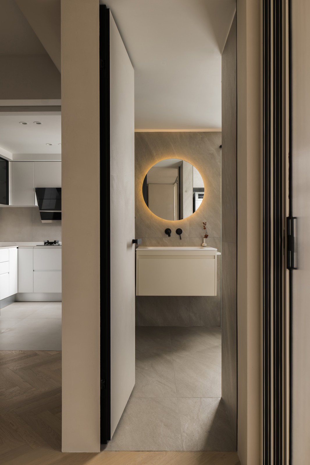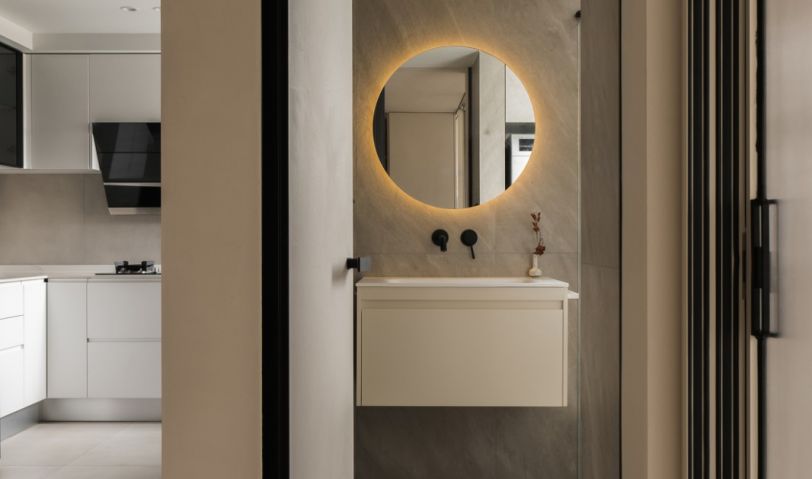 洗手間的布局經(jīng)過精心考量,將干區(qū)設(shè)置在正對門體的方位,即使不管上門也比較美觀,懸空式浴室柜、一體式臺盆、入墻式水龍頭和圓形浴室鏡,看上去簡潔大方,顏值和實用性兼有