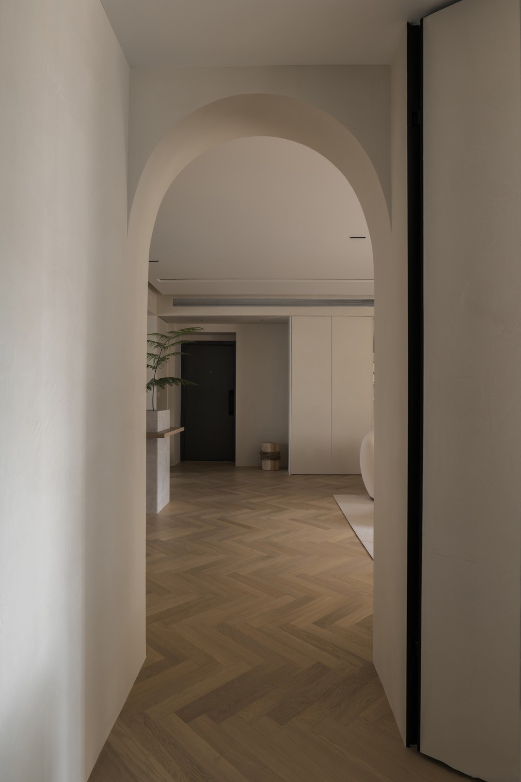 從走廊看向主臥,左側(cè)為書房,全屋地板通鋪無門檻石,也無踢腳線,視覺上更加整潔干凈,門體開到頂端,更顯開闊大氣,門體材質(zhì)與墻壁選擇同樣的微水泥,隱形門的設(shè)計讓家的氣質(zhì)更顯簡約