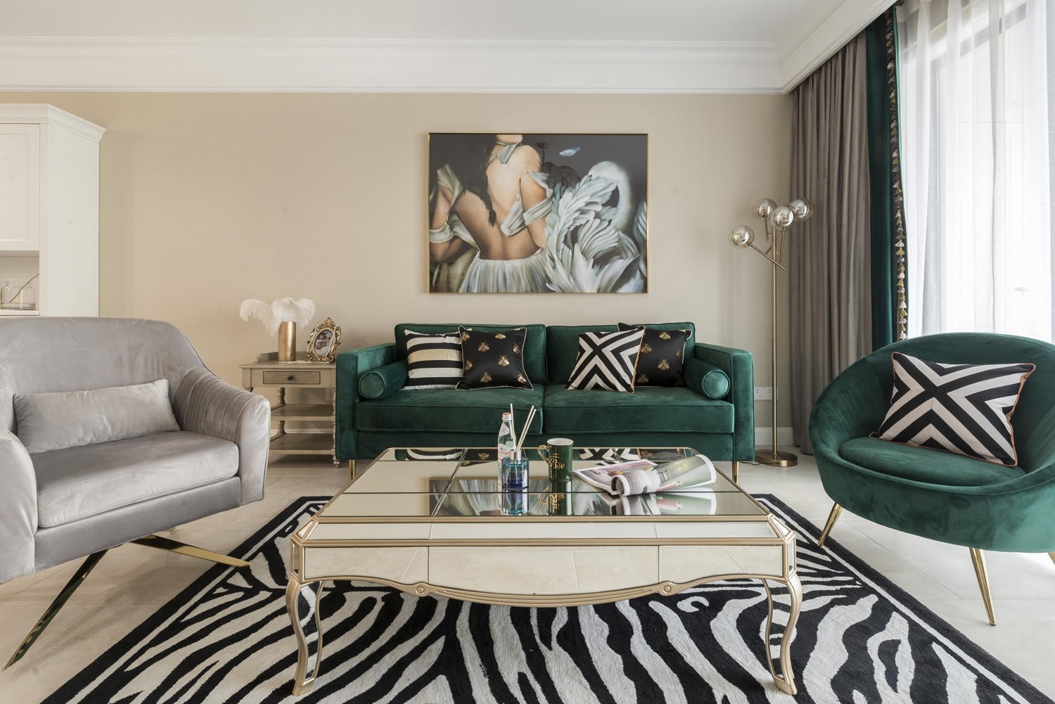 業(yè)主為中年夫妻二人,家里常住人口為三口人,加一個高中女兒,所以業(yè)主想把家裝的比較豪華,看上去比較高端大氣上檔次。為了讓整個客廳看上去不至于太過于單調或者單一,加了一些墨綠元素以及黑白進去,讓客廳更富層次感。