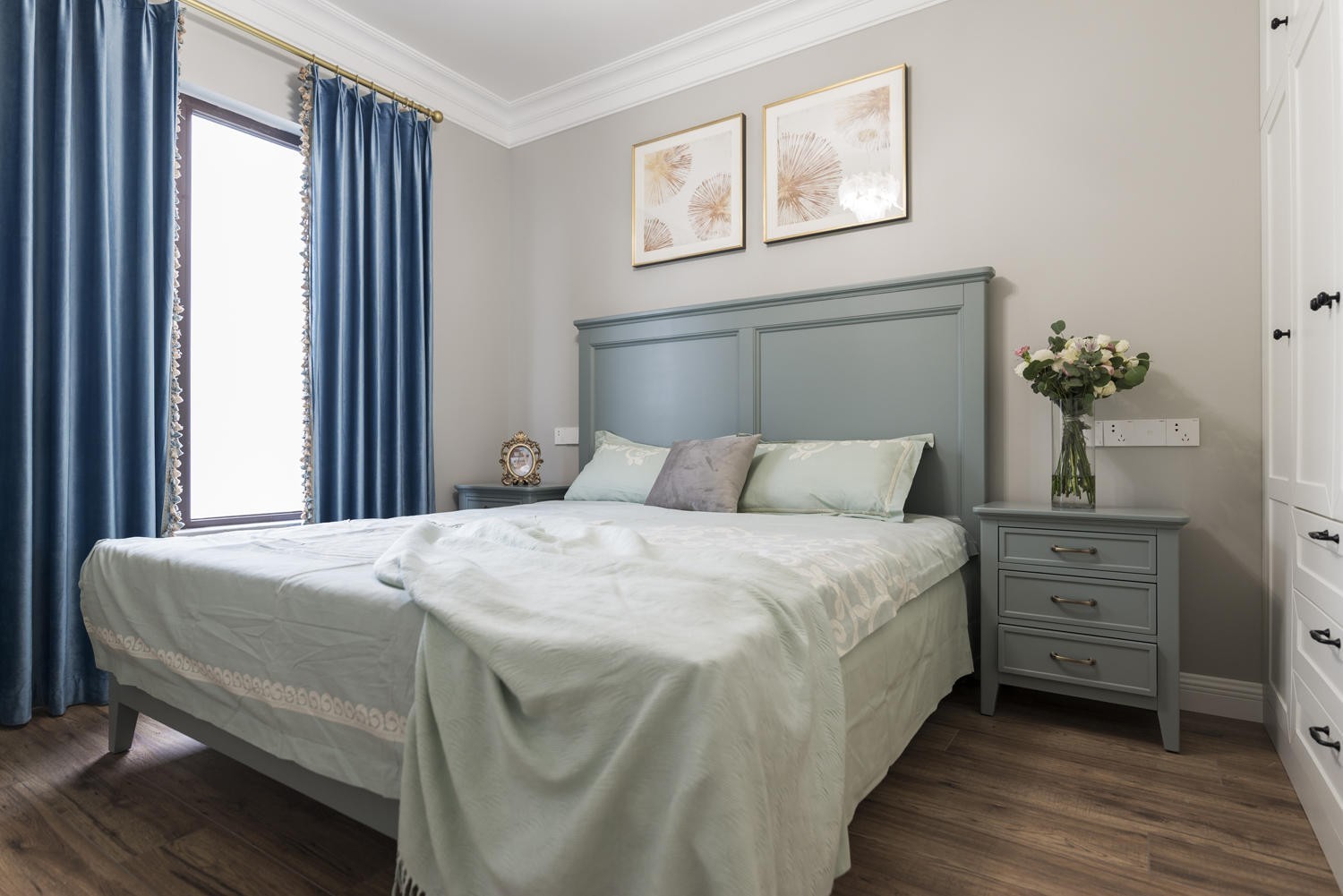 客房作為一個不常用的房間,相對主次臥就更加的簡單隨意了,墻面沒有做任何造型,只是簡單了掛畫來裝飾搭配。此臥室兼?zhèn)涞氖强头恳约芭紶柪先诉^來住的作用,所以沒有做復雜或者過多的造型。