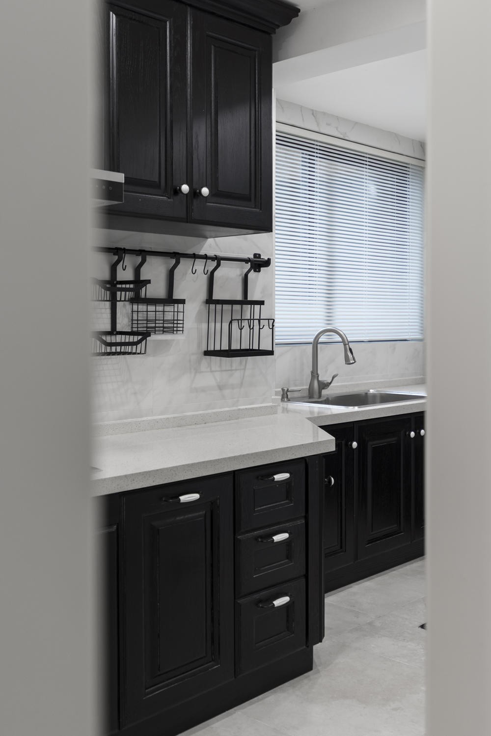 廚房鑒于戶型的限制,所以在本案的話,是只做了簡單的一面地柜來滿足后期的使用需求。沒有做雙邊桂,是考慮到后面的一個站立空間。柜體顏色采用了儒雅黑來進行搭配,經(jīng)典耐看,不失潮流。