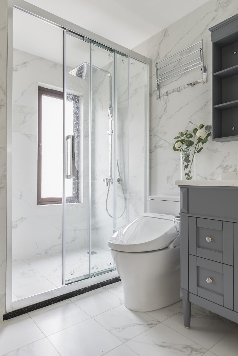 主衛(wèi)的整體效果感覺上與主臥大體相同,整體感覺都是比較簡單素雅,不失豪華。智能馬桶搭配淋浴房,功能分區(qū)格外分明。以便于后期的使用需求,互不干擾。