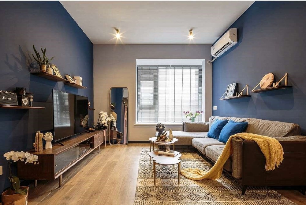 藍(lán)色的墻面乳膠漆配上金色的燈具顯得復(fù)古有質(zhì)感