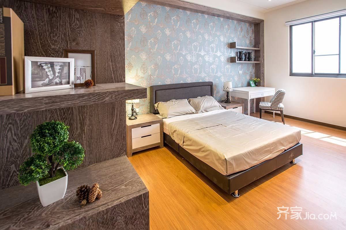 臥室區(qū)域柜體全部定制,床頭背景選用墻紙飾面
