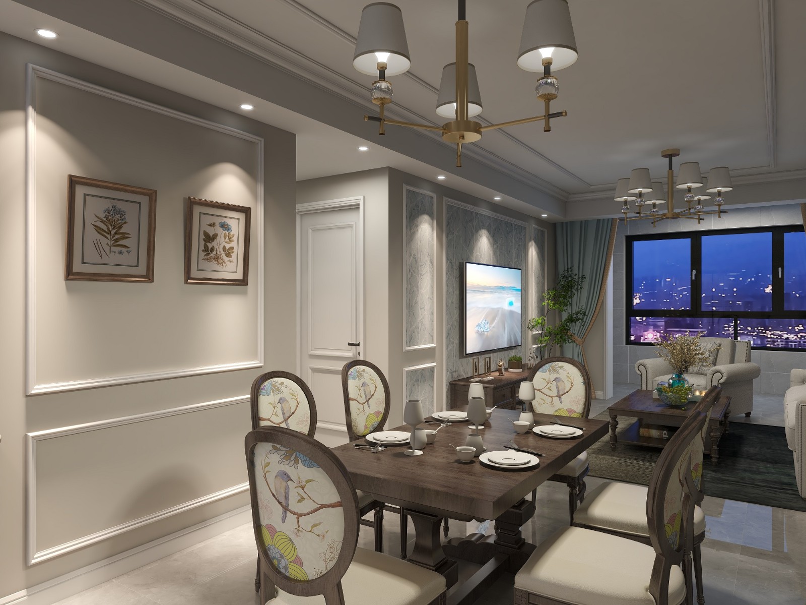 客廳淺色系乳膠漆墻面,搭配淺灰色布藝沙發(fā),提升客廳的舒適感,電視背景墻則用美式經(jīng)典的石膏線裝飾,精致耐看