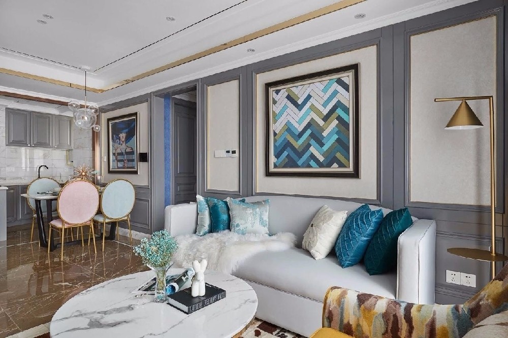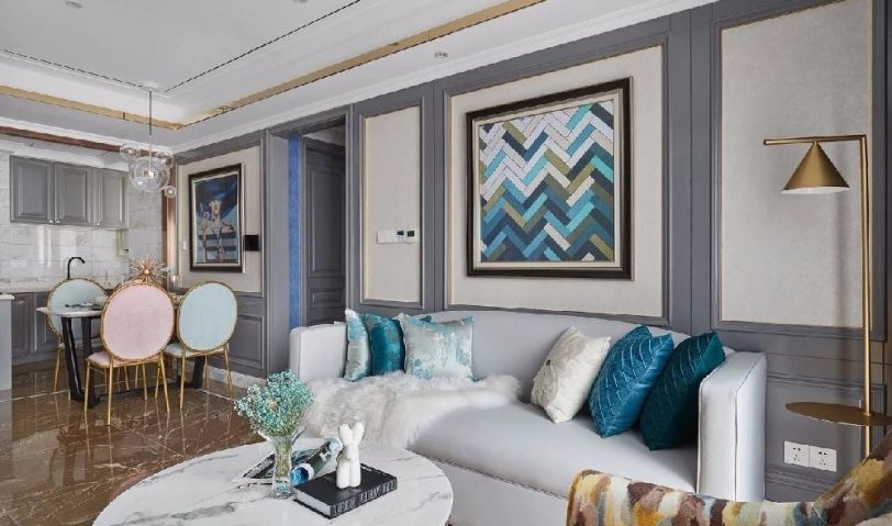 沙發(fā)采用簡單的皮質(zhì)沙發(fā),采用了調(diào)色的沙發(fā)單椅,色調(diào)很閑的華麗??筒蛷d墻面結(jié)合簡單的護墻板和金屬線條結(jié)合,顯得輕奢感更足。