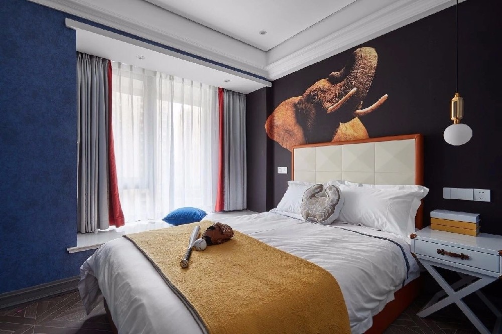 臥室床頭背景用黑色的布畫,整個色調(diào)也顯得很穩(wěn)重。