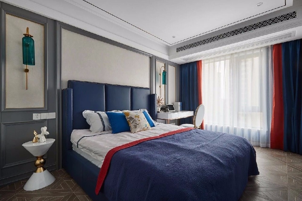 另外一個臥室采用護墻板結(jié)合,深色的皮質(zhì)床,空間很整體。