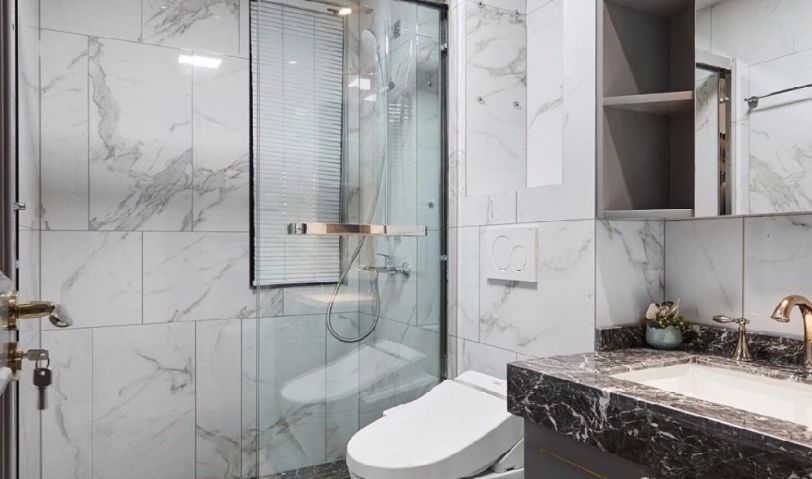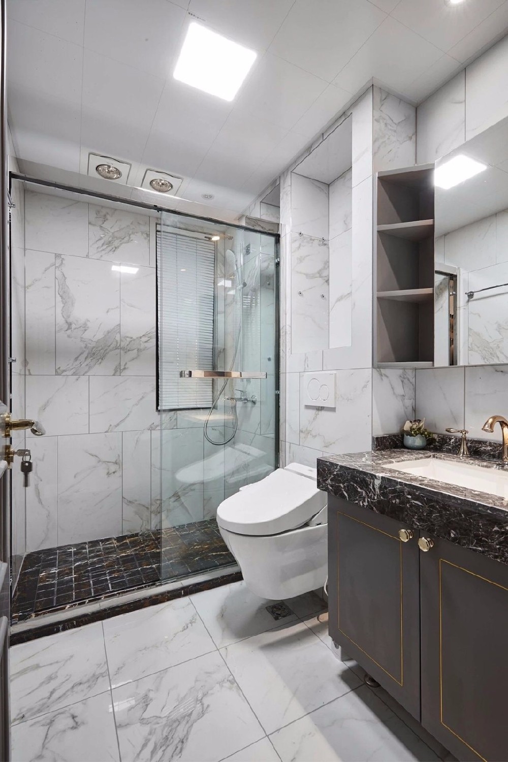 衛(wèi)生間結(jié)合簡單的白色墻磚地磚,用黑色的柜子結(jié)合,空間顯得大氣而不壓抑。