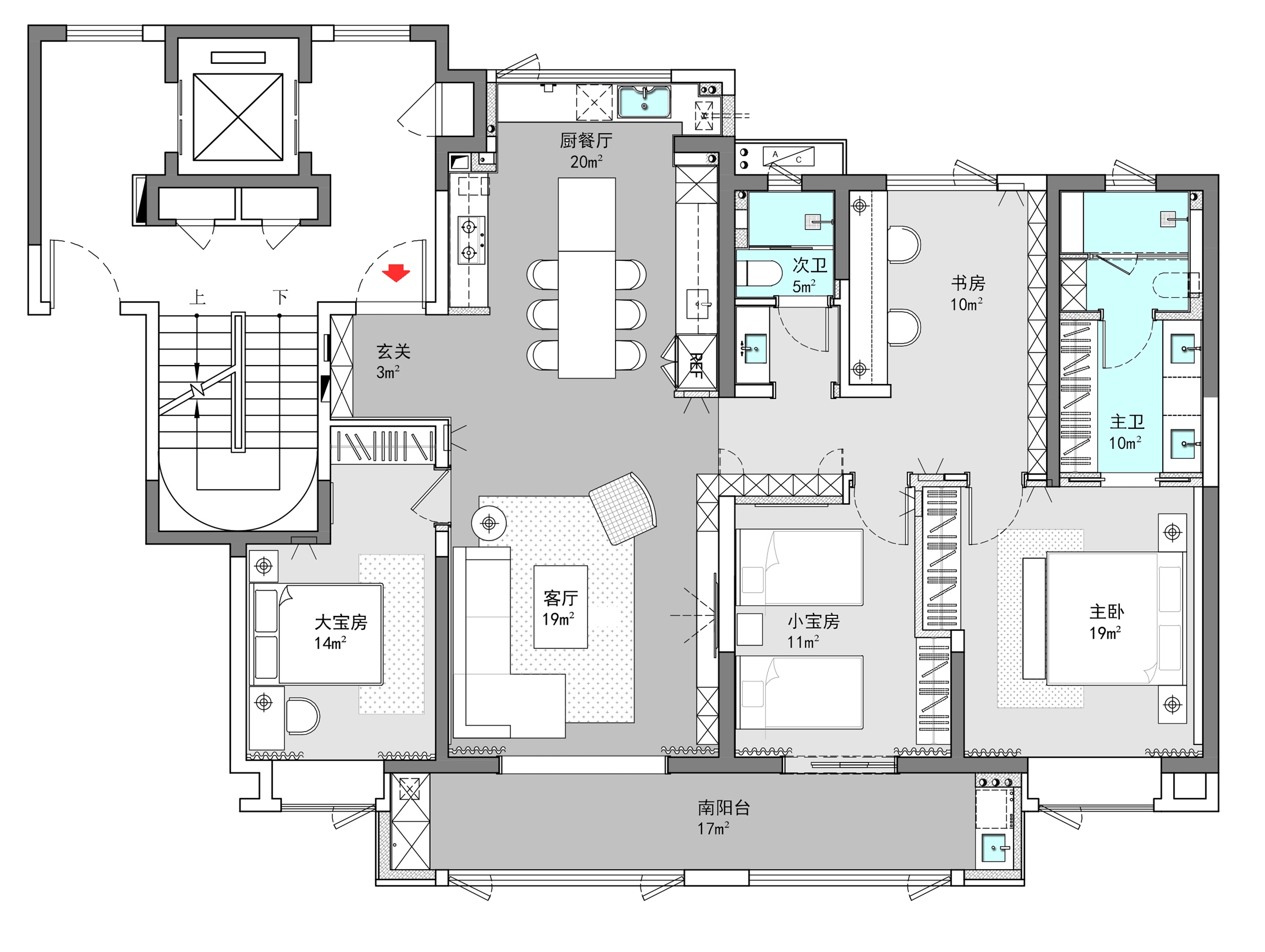 房子原本為四室格局,我們拿到平面圖之后,將朝北的一間改造為公共書房,作為承載三個(gè)孩子的五口人的居住空間,