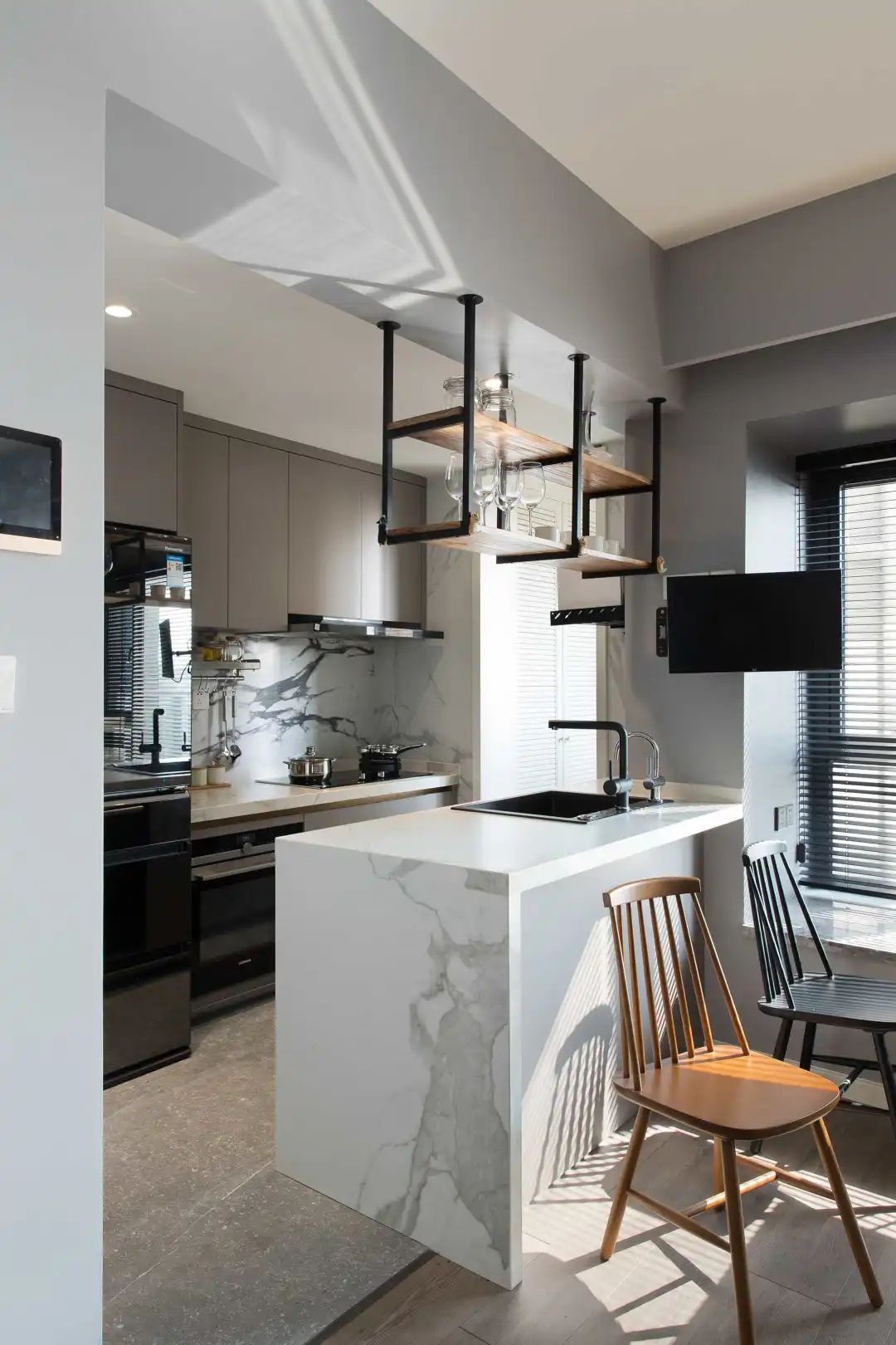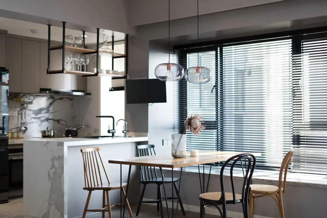 簡約的線條餐桌椅,鐵藝與木質的搭配,工業(yè)風下掛式的酒杯架,猶如愜意的咖啡廳文藝且情調。