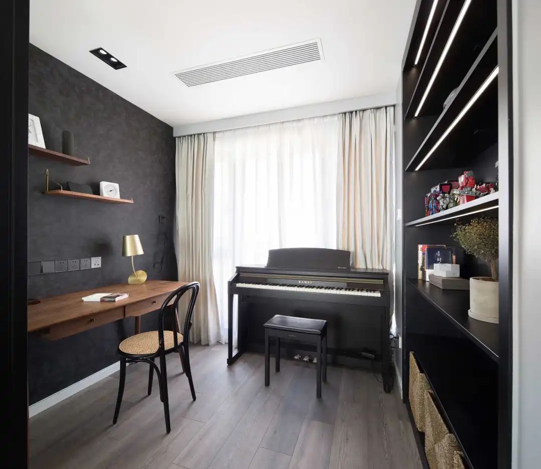 男主人雖然經(jīng)常出差,但有一半時間會在家辦公,所以辦公需要比較安靜的環(huán)境,不希望是開放式書房。書房空間本身不大,所以在不允許視覺空間縮小,影響采光的前提下,用了玻璃折疊門來做隔斷。