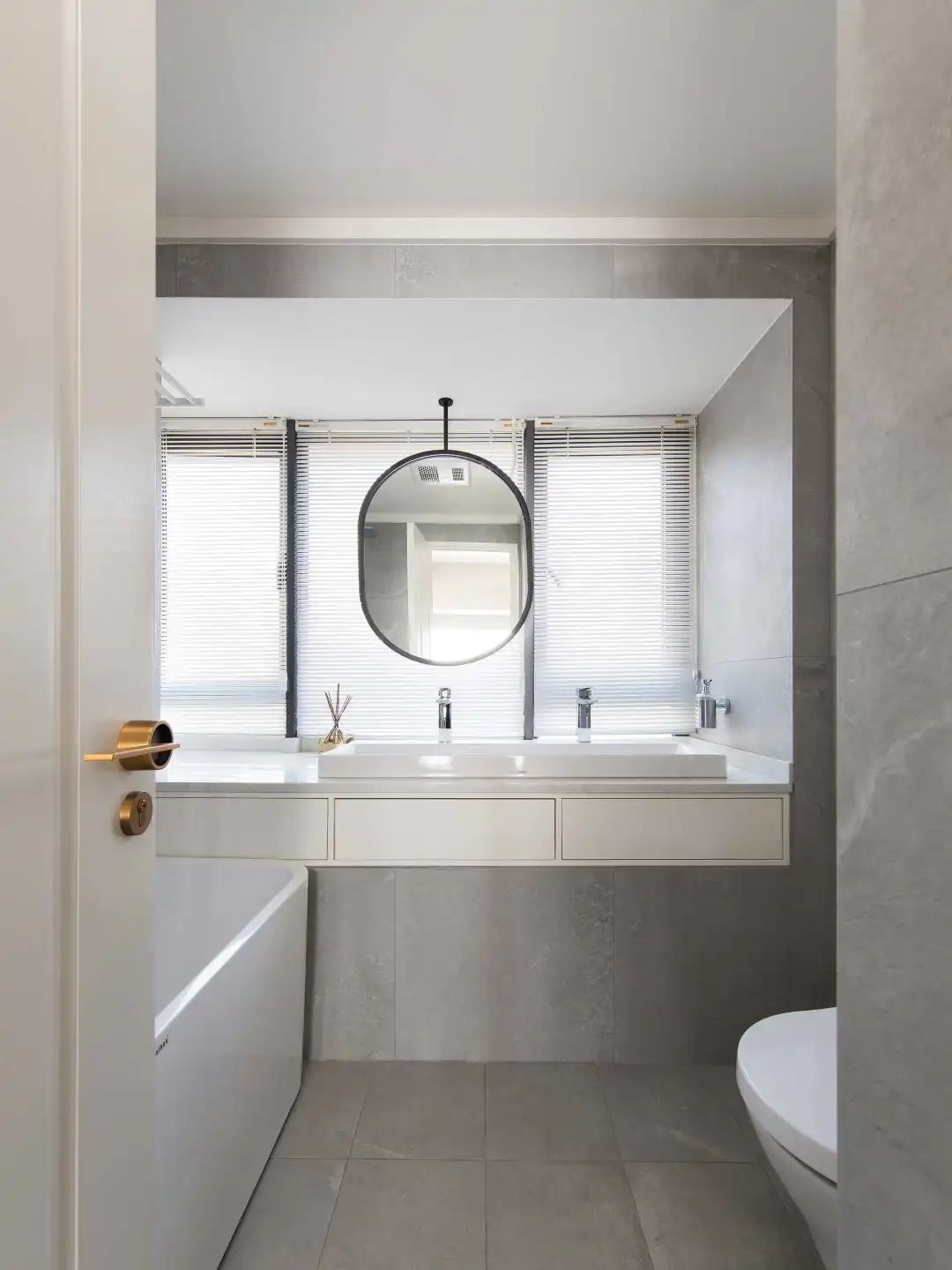 衛(wèi)生間依舊是灰白調,簡單的色彩搭配,使它素凈、明亮且耐看。干凈利落的線條,低調簡約,透露著悠悠靜謐的的氛圍