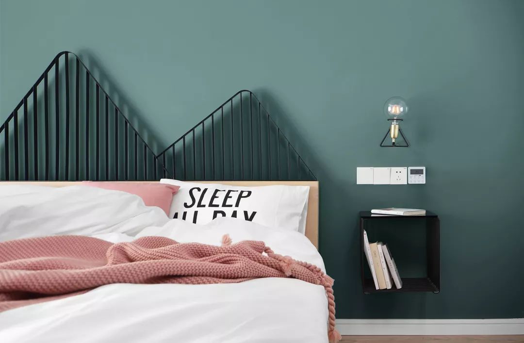 次臥的設計就更具趣味和創(chuàng)意了,墨綠色的背景墻,山體造型的鐵藝床頭靠背,床頭柜是懸空的格子,壁燈的造型也非常有趣。