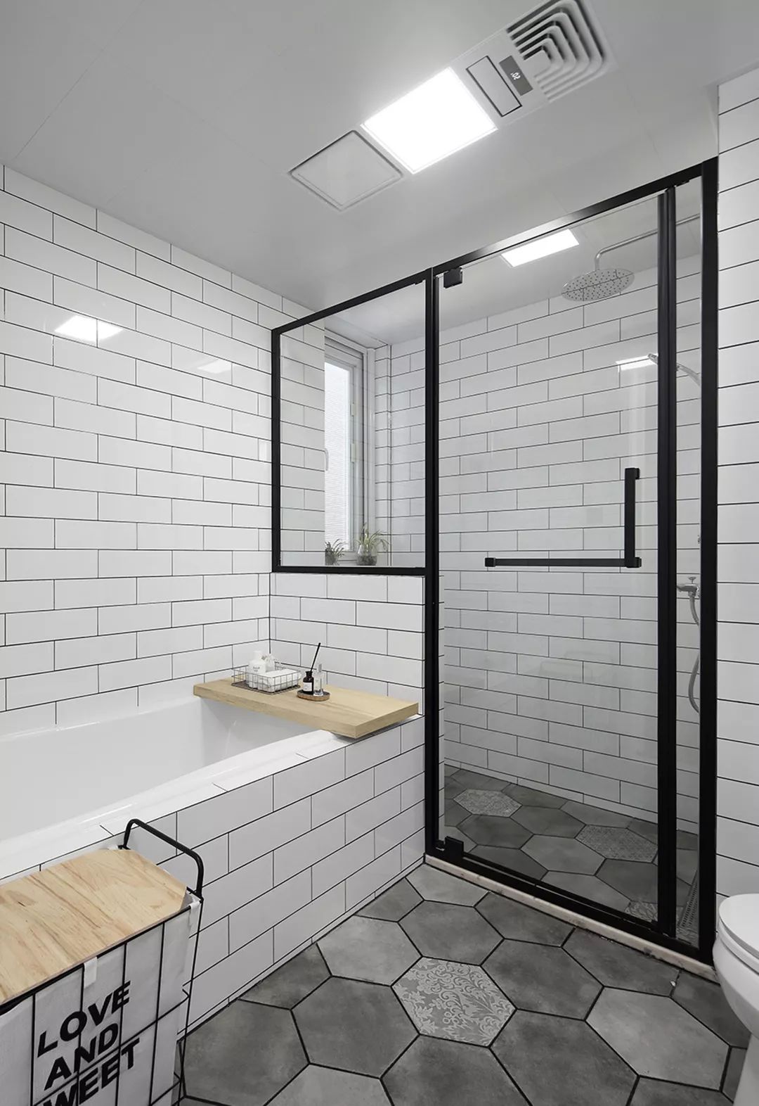 衛(wèi)生間的洗手臺被放在了門外,衛(wèi)生間內部是劃分出淋浴區(qū)、浴缸區(qū)和馬桶區(qū),做舊質感的六邊磚,讓衛(wèi)生間更有文藝范。