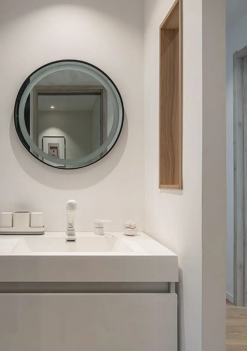 衛(wèi)生間干濕分離,圓形鏡面和開窗設(shè)計,增加空間的通透性和精致感。