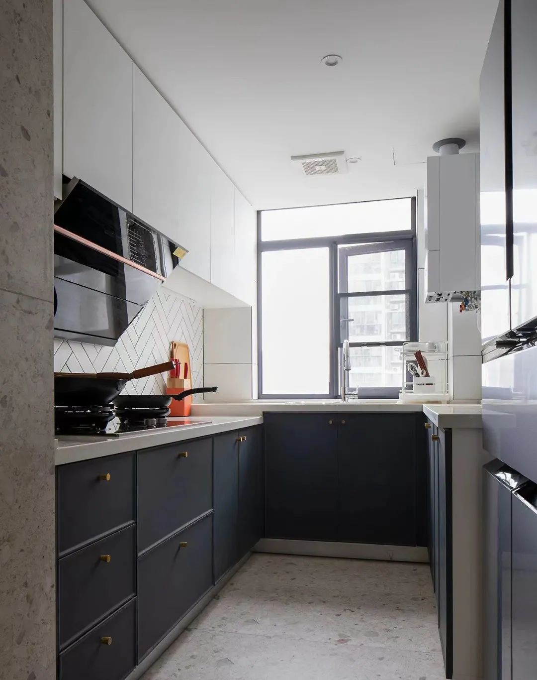 廚房地面水磨石瓷磚和玄關(guān)處瓷磚同款系列,細(xì)節(jié)上進(jìn)行了呼應(yīng)。吊柜用的白色柜門,墻面靠灶臺這面小磚人字鋪,顯得更有層次。
