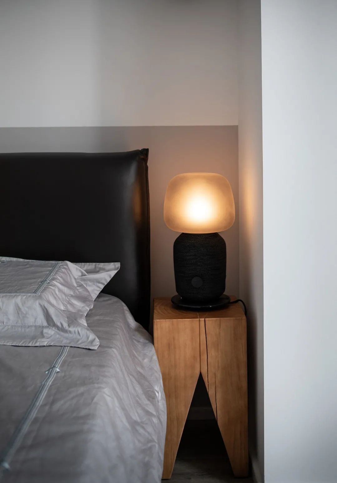 主臥,無主燈設(shè)計(jì)讓空間更顯簡潔,床頭背景做了乳膠漆分色,增加空間層次。將陽臺面積納入臥室,延展了視覺空間。