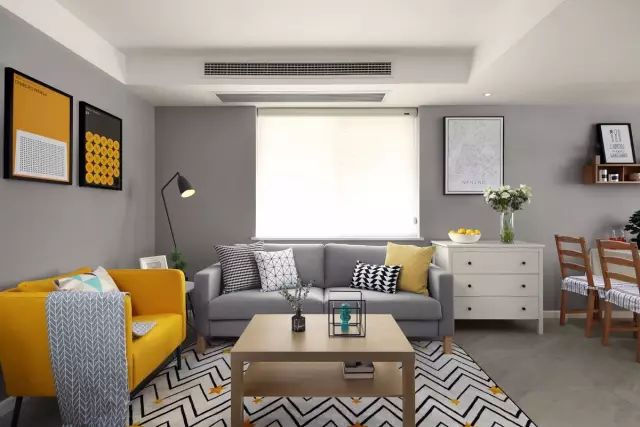 現(xiàn)在是客廳空間,灰色的乳膠漆奠定安靜的氛圍,而隨著些許跳脫的黃色融入,會客區(qū)瞬間變得活潑了起來