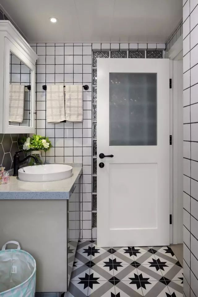 衛(wèi)生間使用黑白灰調(diào)子,顯得明亮干脆。地面花磚的鋪設,我很喜歡。以后我家重新裝修了我也要這樣裝修一番。