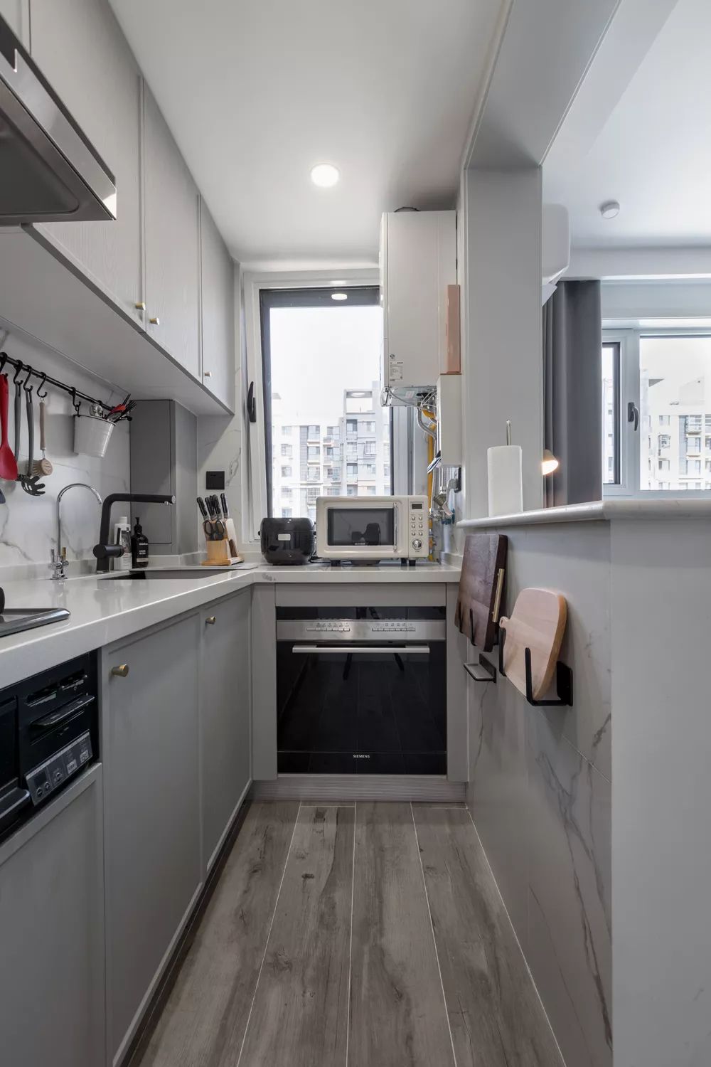 廚房內(nèi)部是做了L形的櫥柜布局方案,半墻后方也被利用起來,掛一些砧板、鍋具等物品。淺灰色的櫥柜看起來輕松而又時尚。