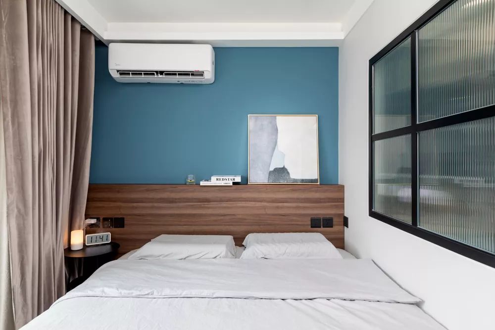 主臥的面積不算很大,床頭靠背做了木質(zhì)造型,上方刷成藍色,帶來更為寧靜的感覺。床靠著墻面擺放,更加緊湊實用。