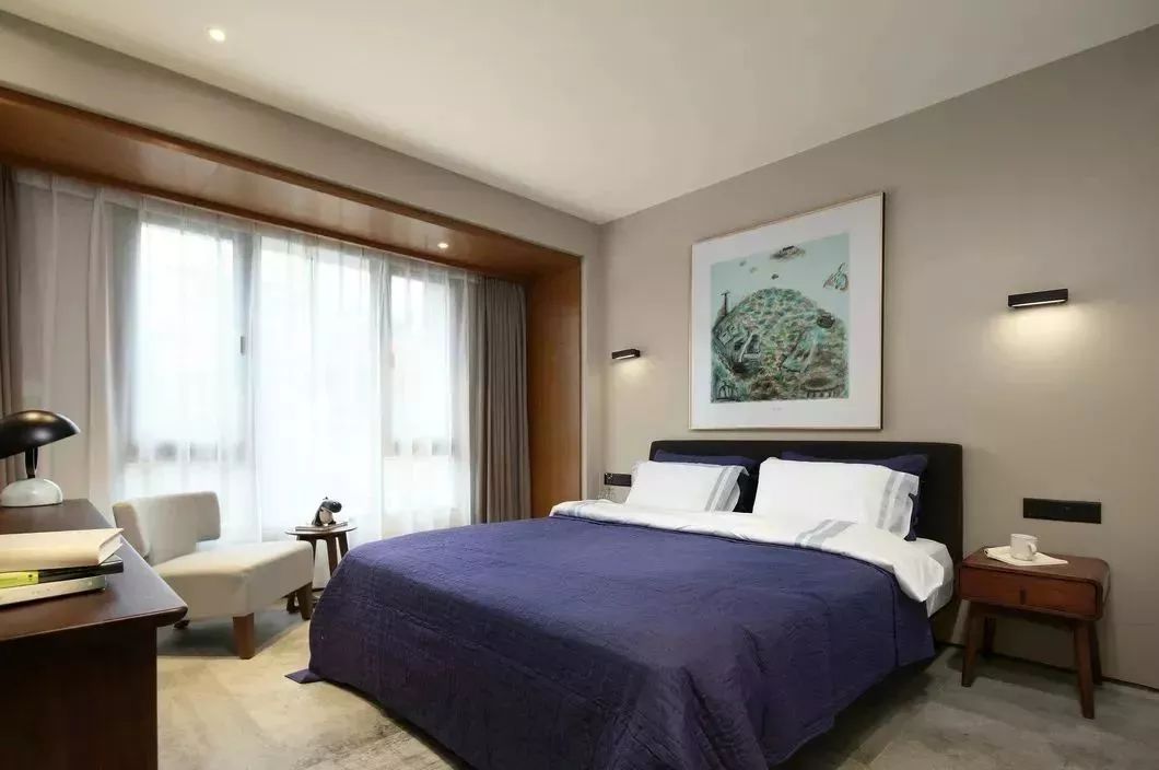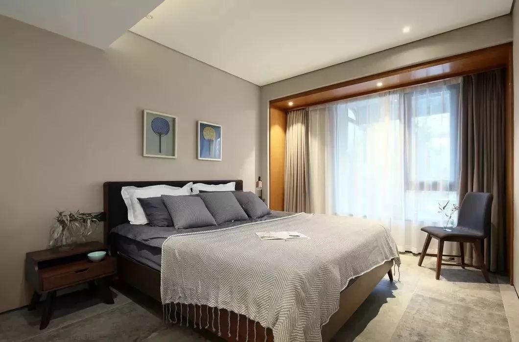 次臥設(shè)計(jì)以溫柔的灰色為主調(diào),做舊的床頭柜與棉麻舒適床品的柔軟相搭,讓空間的質(zhì)感構(gòu)成平衡。