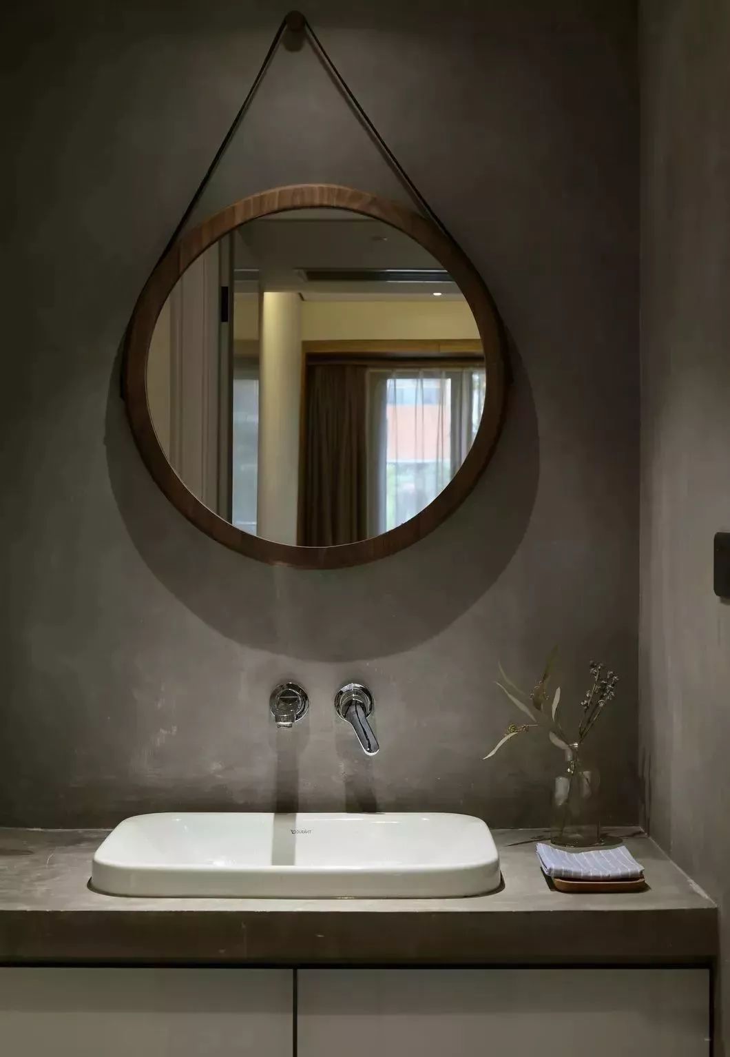 衛(wèi)生間灰白搭配簡(jiǎn)潔美觀。墻上的皮帶原木掛鏡,增添了精致感。
