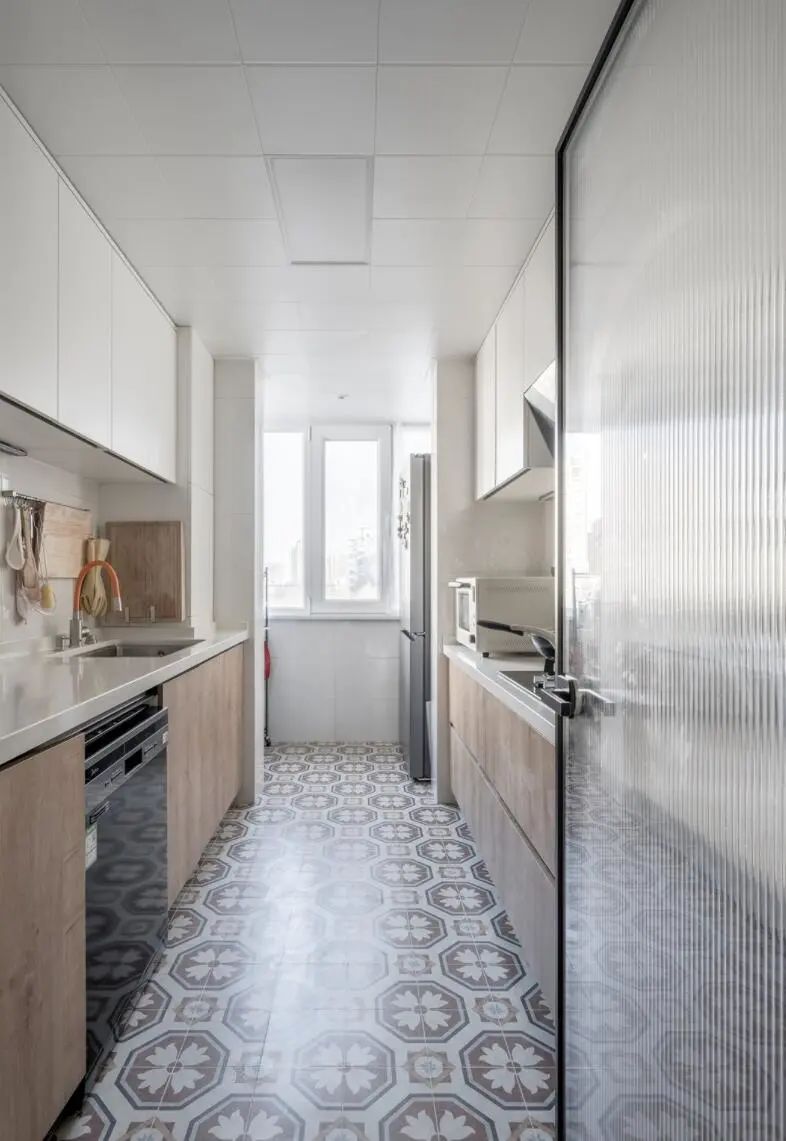 來到廚房,考慮到外面有一個(gè)小陽臺(tái),以及為了充分引入采光,櫥柜就采用了面對面的方式布局。