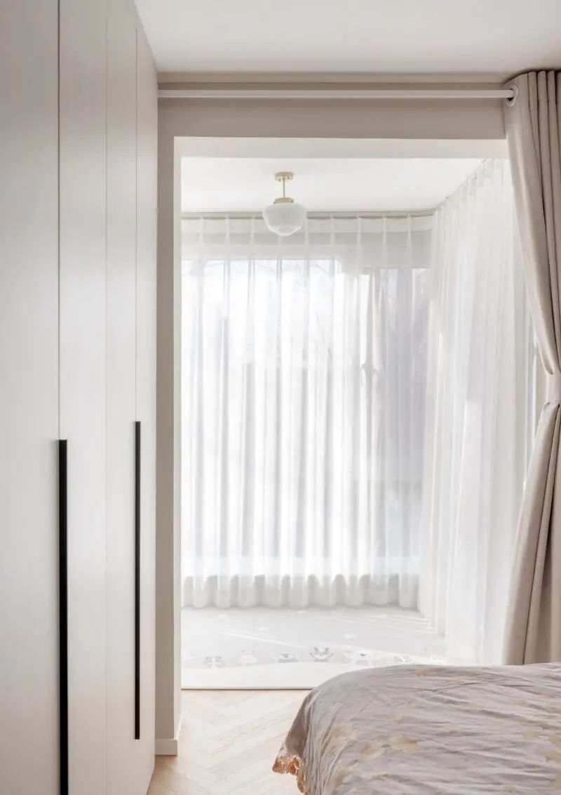 來到主臥,硬裝處理同樣很簡單,只給墻面做了個(gè)跳色處理,看起來既溫馨又治愈。同時(shí),低飽和度的軟裝選擇,也再一次強(qiáng)化了空間的氛圍感。