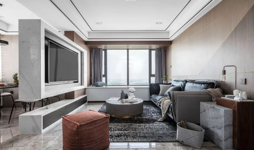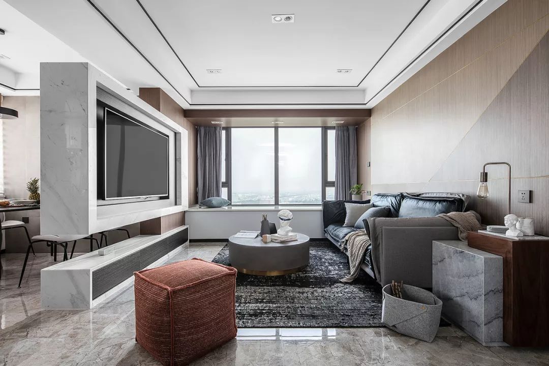 在玄關門廳的另一側就是客廳空間,沙發(fā)背景墻上做了拼色的木飾面板設計,灰色系的窗簾、茶幾、地毯和沙發(fā)結合起來,顯得更加年輕大方。
