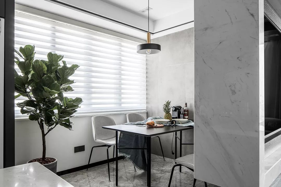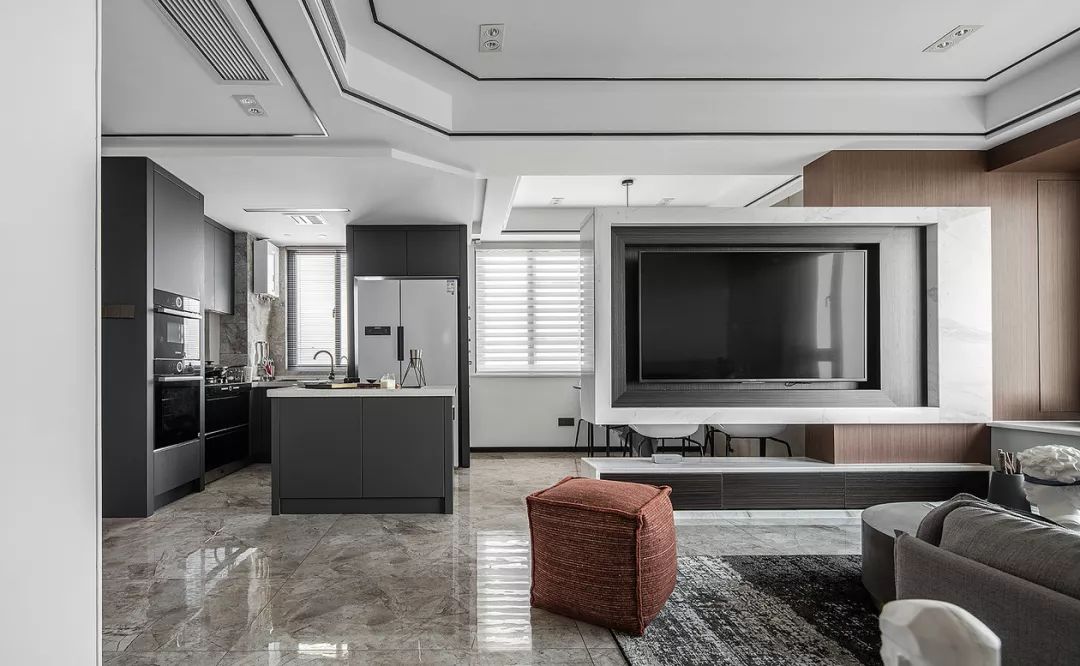從客廳可以看完餐廳和廚房,廚房內部是L型櫥柜搭配島臺的設計,深色系的櫥柜和大理石地面結合起來,顯得精致而又優(yōu)雅。