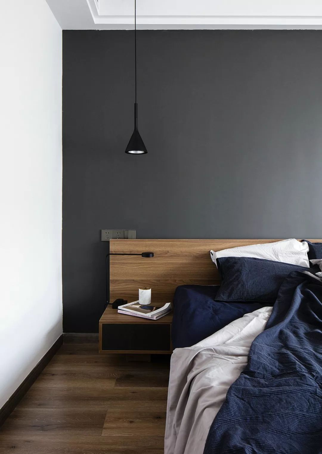 主臥的床頭背景墻刷成了深灰色,結合白色的墻面、吊頂和深藍色的床品,給人一種精致大方的感覺。