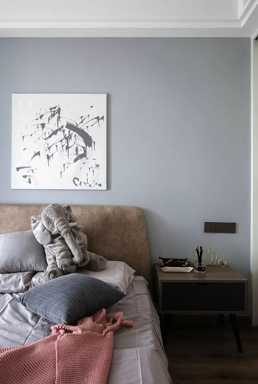 次臥的床頭背景墻刷成了藍灰色,搭配隨意極簡的裝飾畫、棕灰色的床頭靠背,營造一個輕松松的空間,令人感覺愜意而又自然。