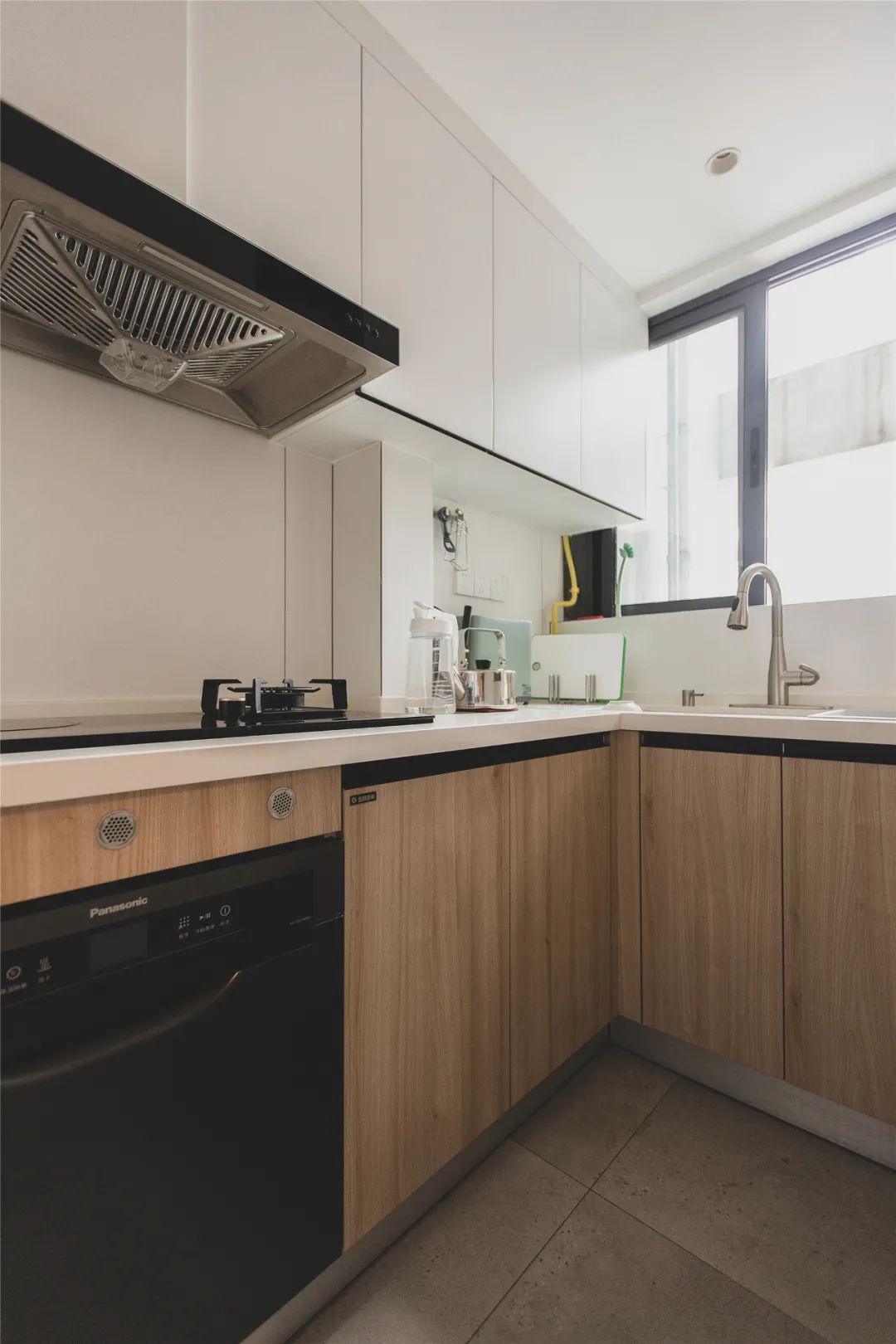 封起來(lái)的廚房,還放下了冰箱和洗衣機(jī),延伸出來(lái)的臺(tái)面可以用來(lái)放置采購(gòu)的食材和常用的小家電。