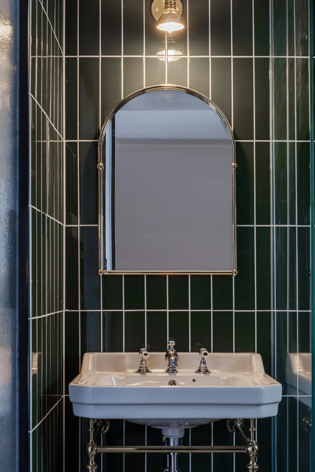 衛(wèi)生間延續(xù)了整體工業(yè)與復(fù)古融合的基調(diào),墨綠色的墻磚質(zhì)感更顯突出。
