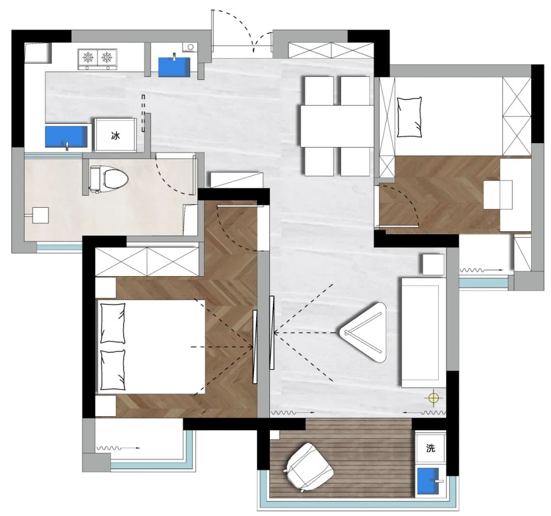從入戶到客廳,都是以白色為主色,奠定空間簡潔明快的基調(diào),紅色做為點綴色,藍(lán)色等深色去平衡色彩的輕重關(guān)系,也豐富了空間的層次。