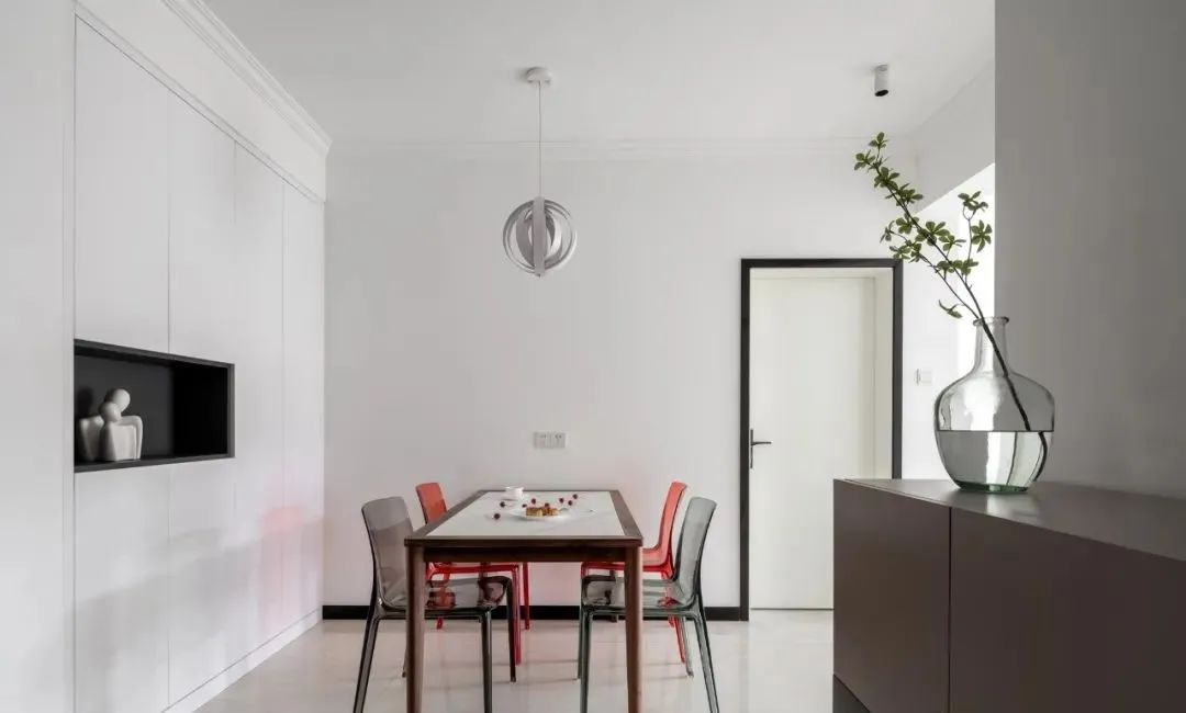 進(jìn)門左側(cè)就是餐廳,靠墻做了一面通頂入墻收納柜,可滿足玄關(guān)和餐廳的收納需求。白色柜門采用暗拉手設(shè)計,中間留空的位置為黑色,與白色形成對比,簡潔不失時尚感。