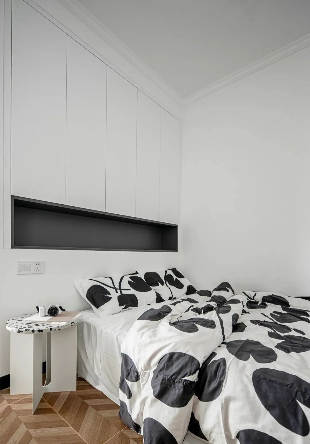 次臥床頭以及床尾都做了柜體用來儲物,拋棄榻榻米,買了無漆床+乳膠床墊。