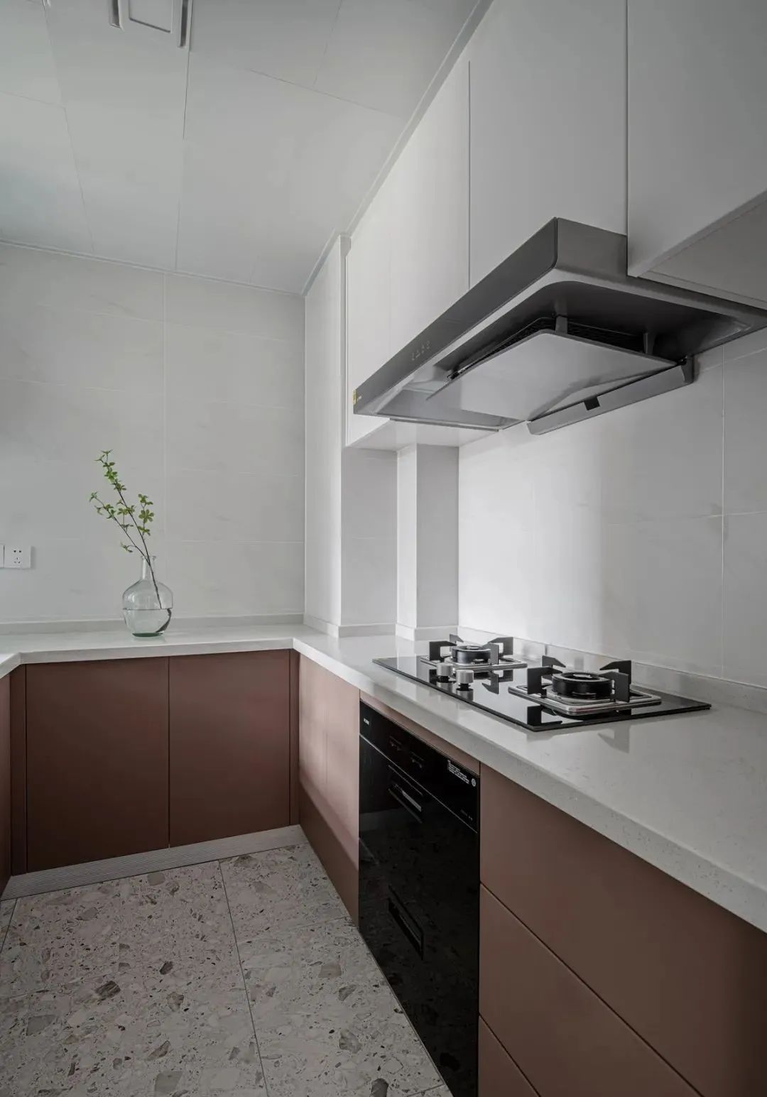 廚房整體以白色為基調(diào),干凈整潔,鐵銹紅的地柜門和大顆粒的水磨石地面,豐富了氛圍且拉伸了空間