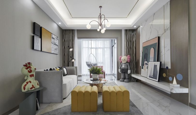 米白質(zhì)感石材和灰調(diào)家具營(yíng)造現(xiàn)代感,一抹明媚的黃率先闖入眼簾,融入簡(jiǎn)約幾何圖形的軟裝飾品