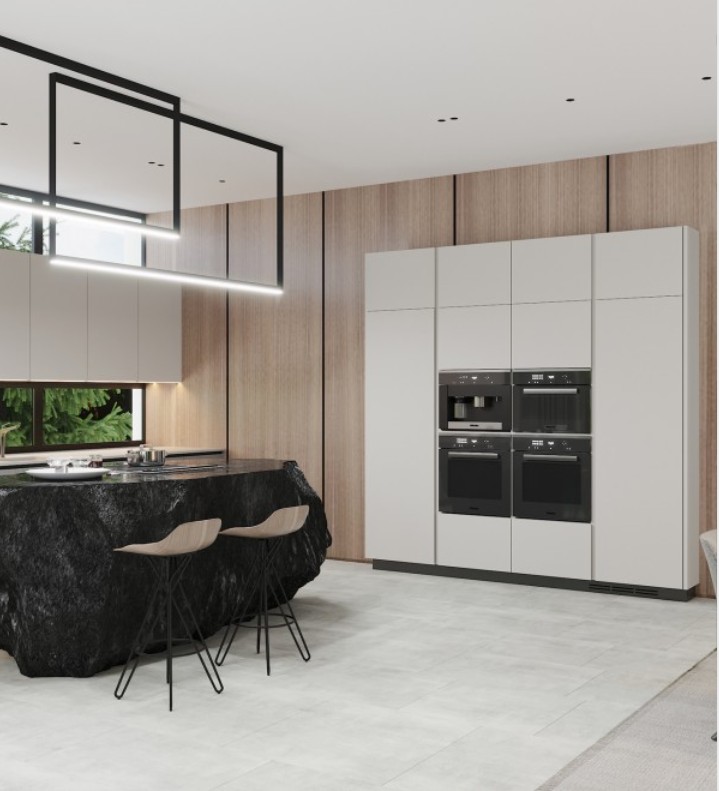 廚房采用不規(guī)則臺(tái)面,打破整體的線條感,讓房間充滿動(dòng)感