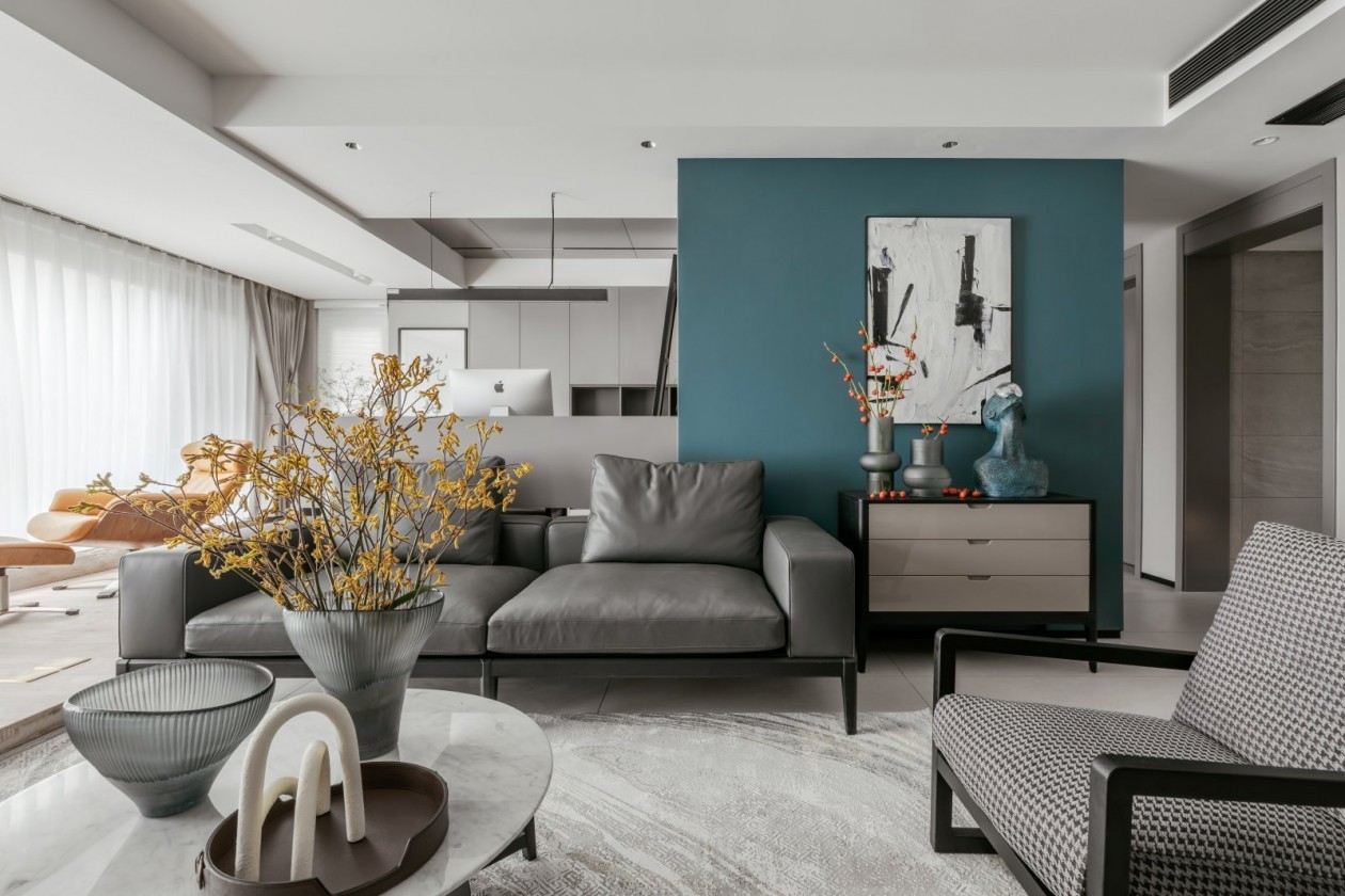 整個(gè)客廳以灰色作為基調(diào),和諧統(tǒng)一,從進(jìn)入空間的一剎那,視線毫無阻隔,大面積落地窗開闊明亮,電視背景收納柜滿足了功能與美感的協(xié)調(diào),沒有過多的造型和裝飾,一切從簡(jiǎn)約出發(fā)。
