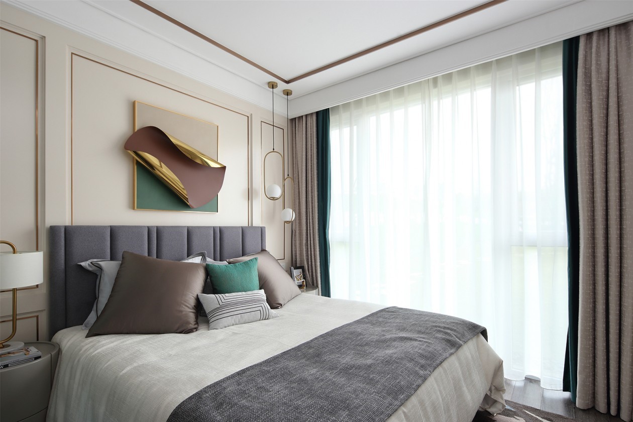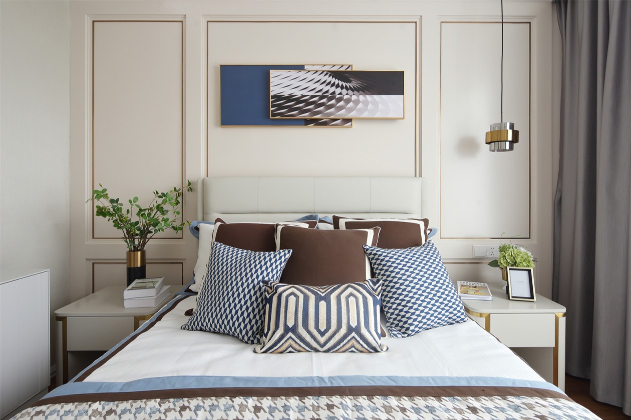次臥選用與綠色同一色系的藍(lán)色勾勒休憩之所,冷靜內(nèi)斂,偶爾點(diǎn)綴的金色,與生氣盎然的綠植,又傳遞出絲絲活力