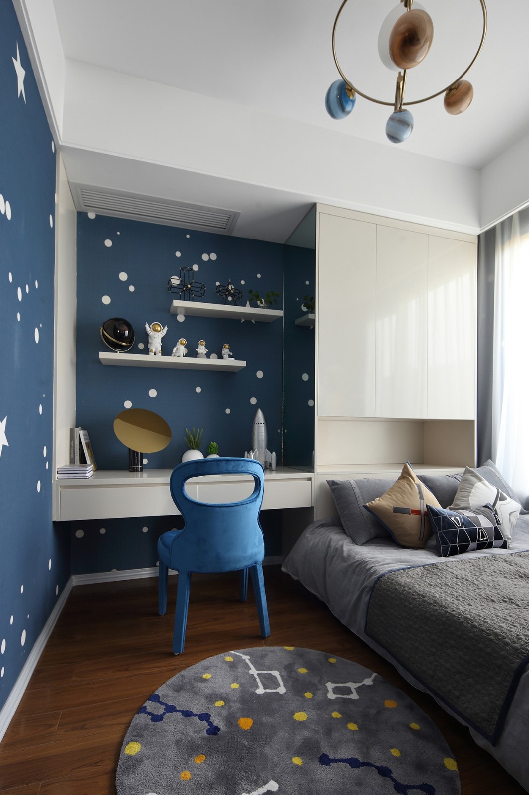 兒童房采用爛漫的星空探索主題,藍(lán)色的星空與頭頂?shù)男乔颍碱H具趣味,激發(fā)孩子關(guān)于宇宙的無限想象力。